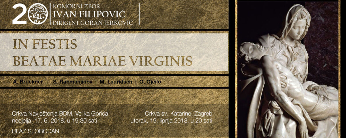 Još jedan u nizu od obljetničkih koncerata Komornog zbora “Ivan Filipović”, In festis Beatae Mariae Virginis, koncert je u a cappella ruhu i pogled usmjerava prema Blaženoj Djevici Mariji, nježnom cvijetu koji se kao inspiracija provlači poput niti u nebrojenim kompozicijama.